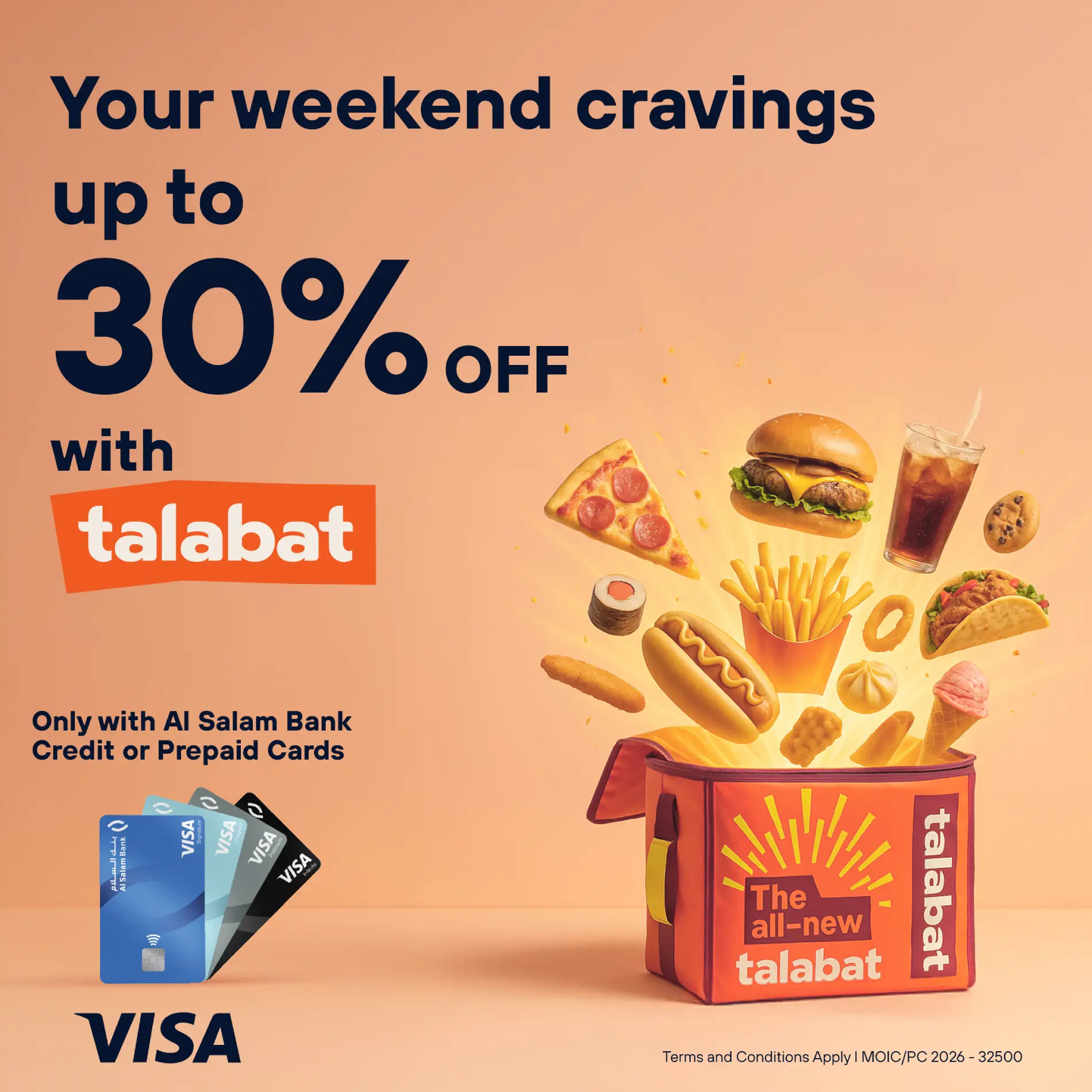 Enjoy up to 30% off (capped to BD 3) when using the promo code ASB30 when you order on talabat using your Al Salam Bank Visa Credit or Prepaid Card.