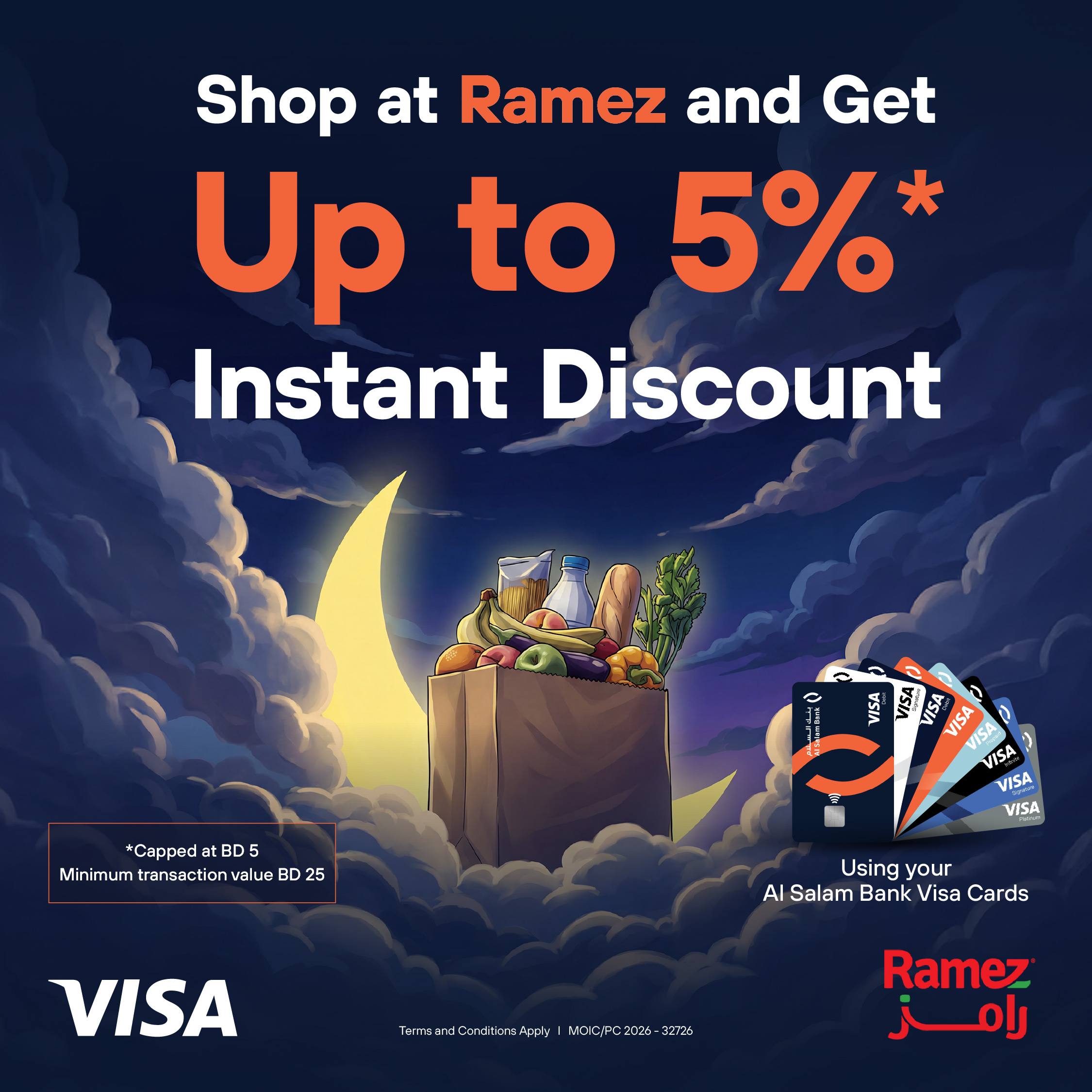 Up to 5% discount (capped at BD5) for purchases of BD25 or more at Ramez App or stores effective 18 February to 4 March to 2026 with Al Salam Bank Visa Debit, Prepaid and Credit Cards