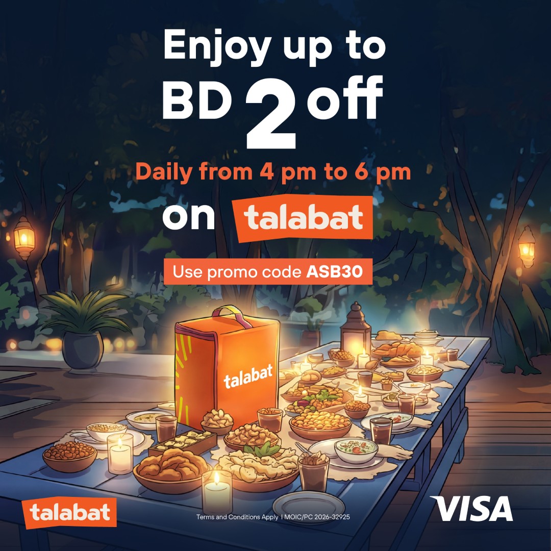 Enjoy 30% off (capped at BD 2) when you order on talabat using promo code ASB30 and pay with your Al Salam Bank Credit or Prepaid Card.